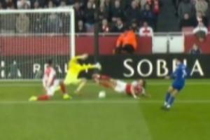 比赛第17分钟,恩迪亚耶的传中被拉亚扑了一下,麦克尼尔门前的近距离补射被已经倒地的卡拉菲奥里用一个非常奇怪的姿势极限封堵了出来!