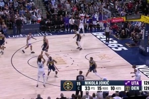 比赛进行到关键时刻,掘金球星约基奇助攻卡梅隆·约翰逊命中底角三分球终于追平比分,同时自己的数据来到33分15篮板10助攻的三双。