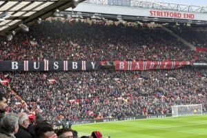 慕尼黑空难68周年,曼联球迷在老特拉福德悬挂“巴斯比宝贝”横幅